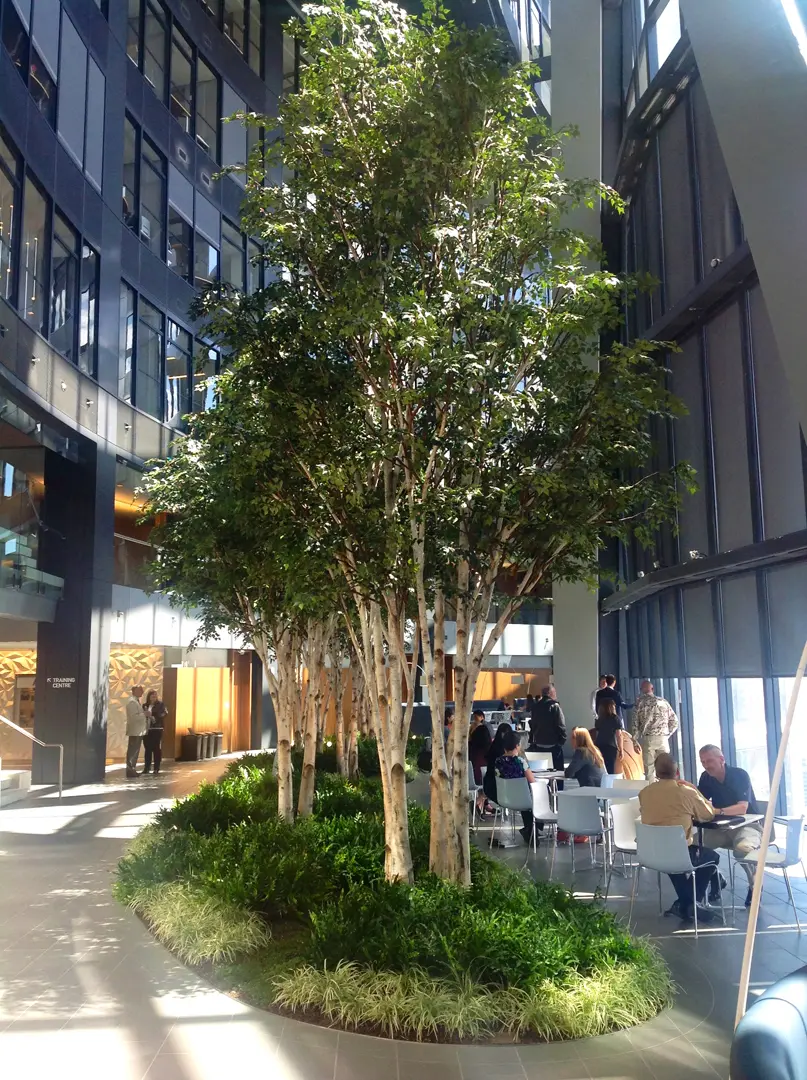 Multi-trunk birch configurations fill double-height atriums naturally. White trunks and high canopies bring organic contrast to glass and steel corporate environments.