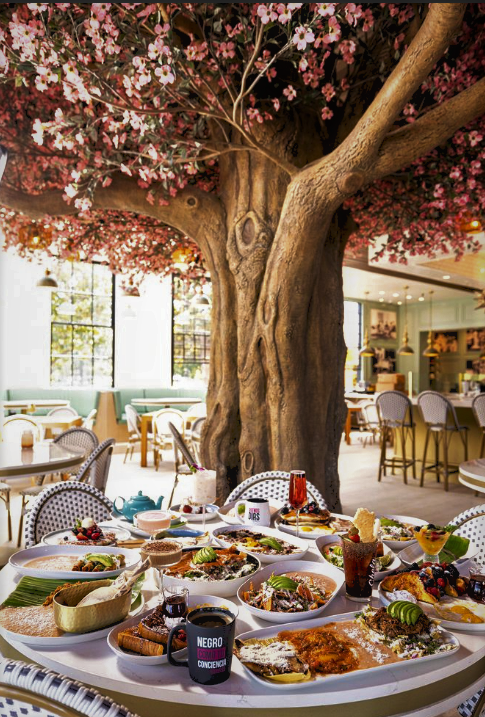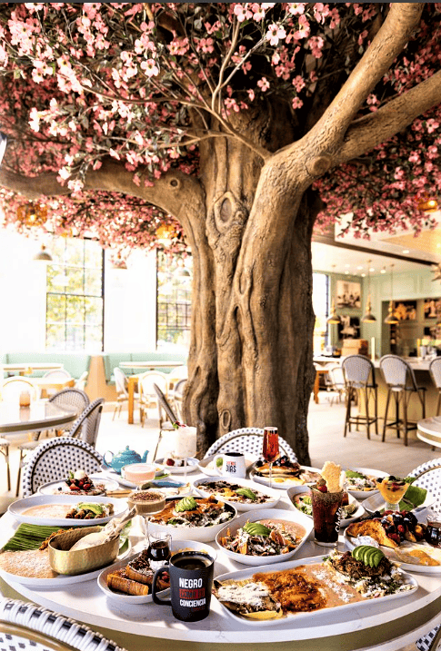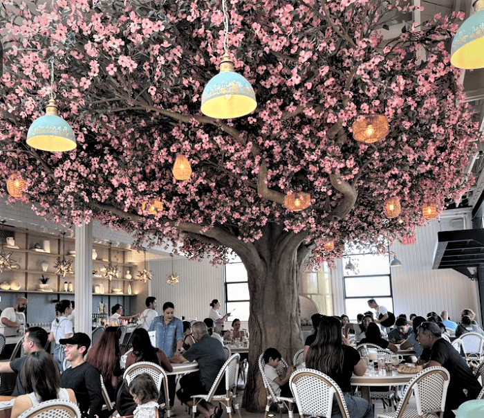Seasonal botanical design without the seasonal replacement cycle. Cherry blossom trees draw guests in and give spaces a photogenic, shareable quality.
