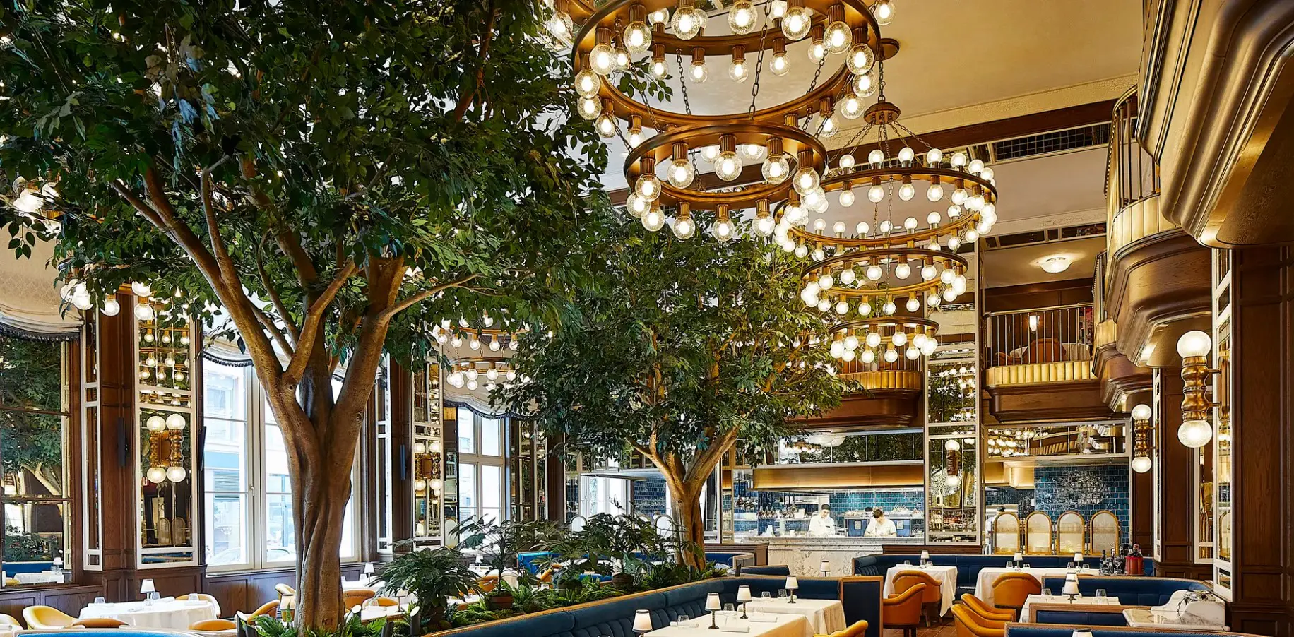Inside the glamorous dining room of Café Carmellini, two custom-crafted 16-foot ficus trees stand tall beneath grand chandeliers, blending old-world elegance with biophilic design.