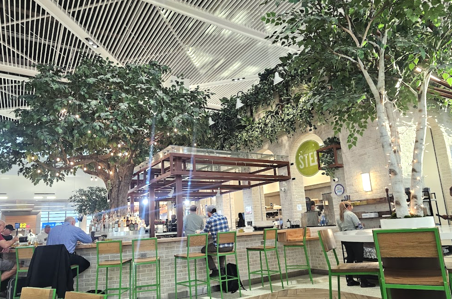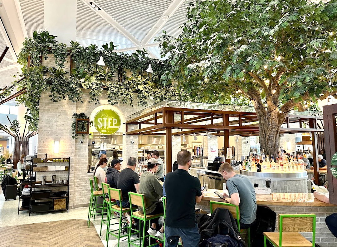 As part of the dramatic reimagining of Terminal A at Newark Liberty International Airport, the Kitchen Step Restaurant invites travelers into a vibrant garden bar experience anchored by a showstopping 18-foot tall oak tree, adorned with twinkle lights that create a soft, welcoming glow. The tree crowns the circular bar at the heart of the space, offering a stunning visual focal point that blends nature with modern hospitality design.