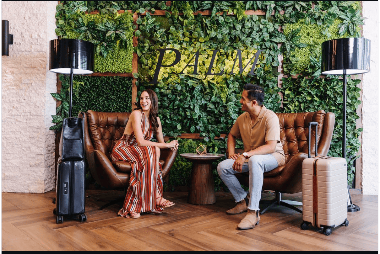 Framed by textured stone and flanked by mid-century-inspired lounge chairs, the greenery softens the architecture and reinforces the Palm Garden’s identity as a warm, welcoming, California-chic retreat.