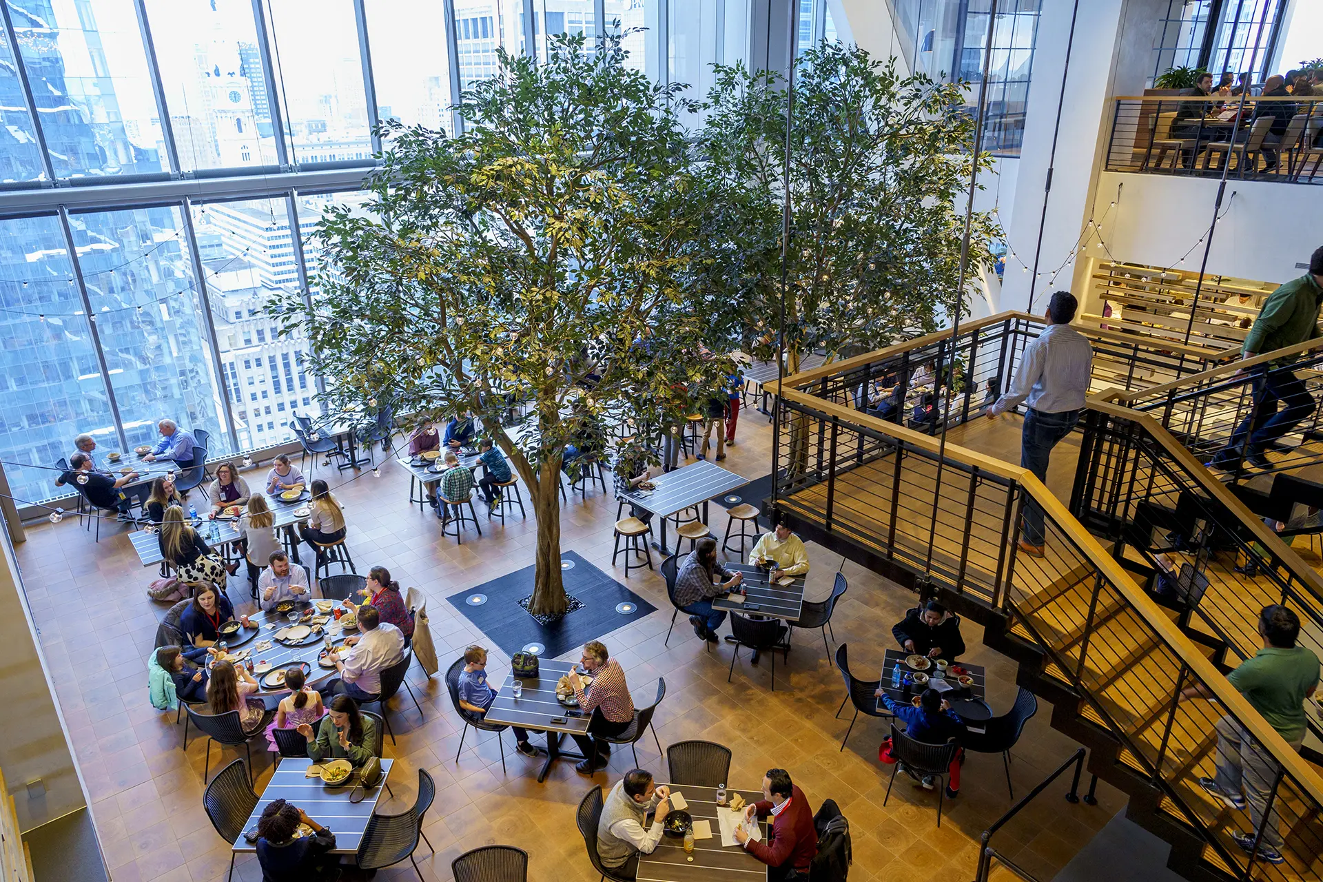Suspended high above the city on the 27th floor of the Comcast Center, two striking 21-foot ficus trees bring natural serenity to the heart of this modern workplace dining destination.