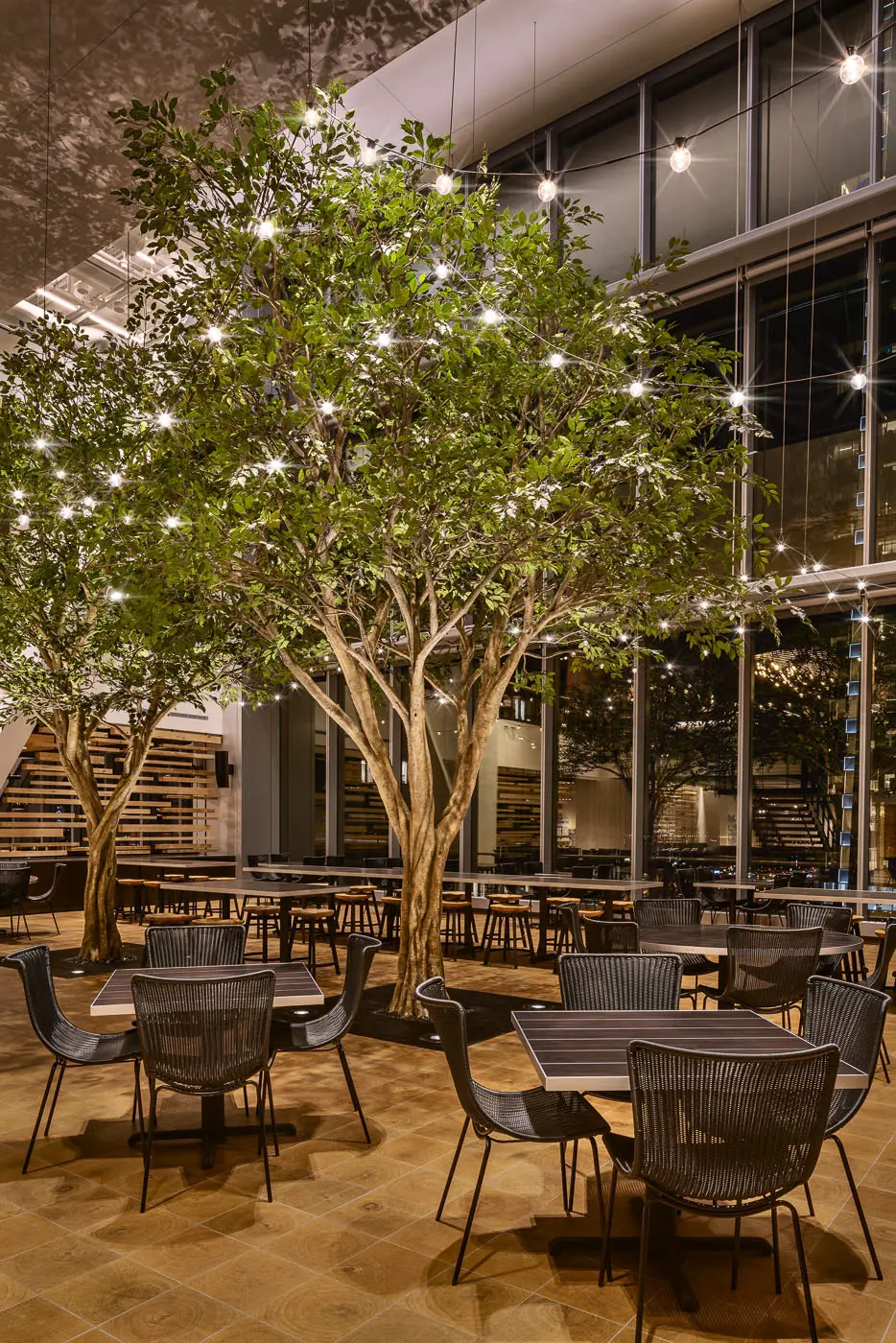 Designed and handcrafted by NATUREMAKER®, the ficus trees span 12 feet in canopy diameter, rising through the sunlit glass atrium with graceful trunks and rich green foliage. The installation bridges innovation and biophilia, creating a grounded, garden-like environment that encourages rest, collaboration, and creativity—whether you’re grabbing lunch or taking in the skyline.