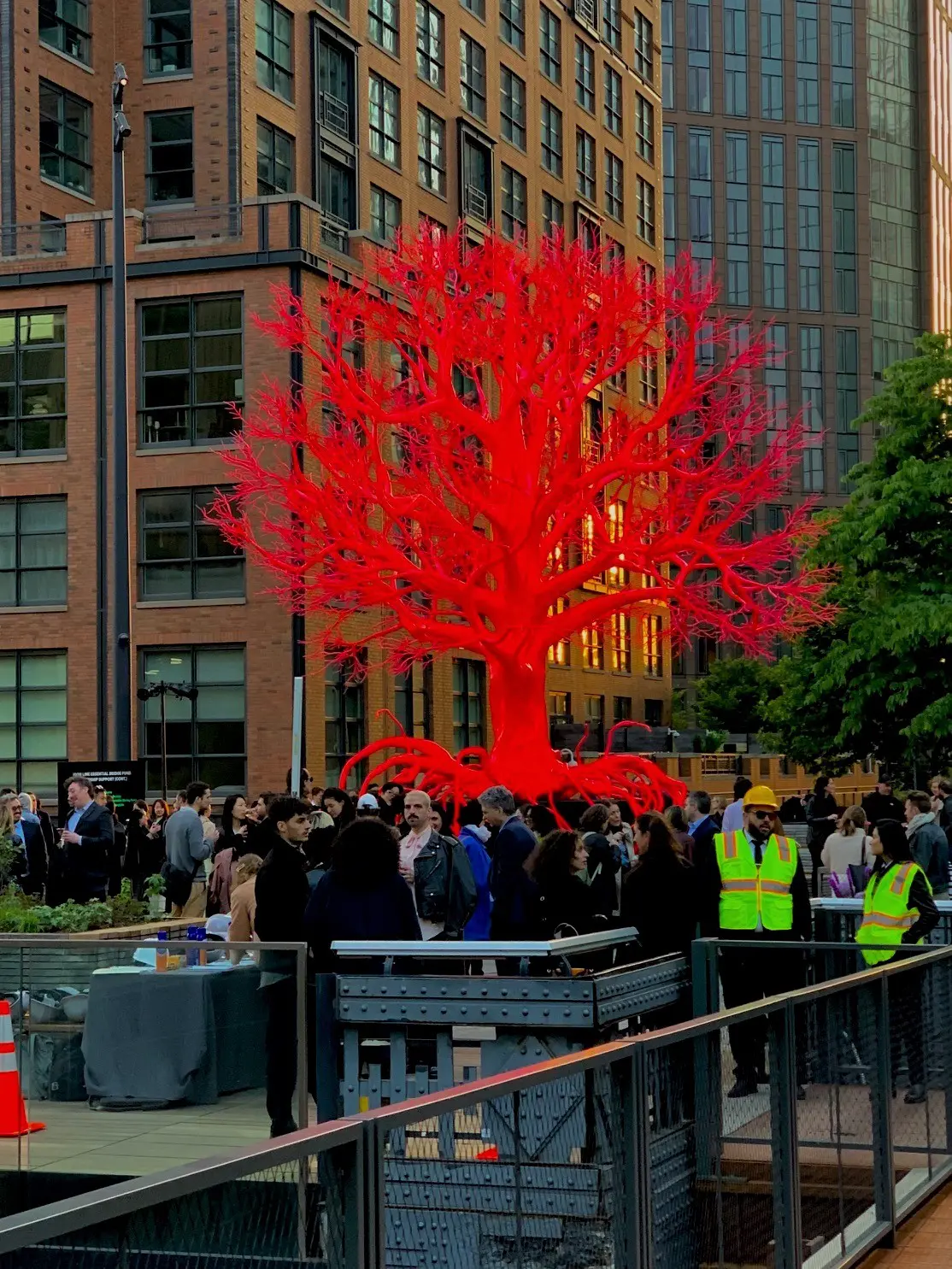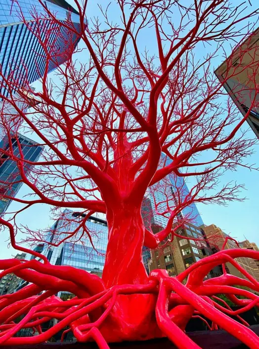 Standing 24 feet tall with a vibrant 24-foot canopy, The Old Tree brings a jolt of color and contemplation to New York’s iconic High Line. Designed by Swiss artist Pamela Rosenkranz and produced by NATUREMAKER®, this striking installation invites viewers to explore the connections between nature, art, and synthetic life.Vivid red branches twist skyward, illuminated by the surrounding cityscape, while thick sculptural roots seem to pulse with life—evoking blood vessels, neural networks, and ancient mythologies. Positioned between towering buildings and ever-changing seasons, The Old Tree offers a moment of awe and curiosity in the heart of Manhattan.
