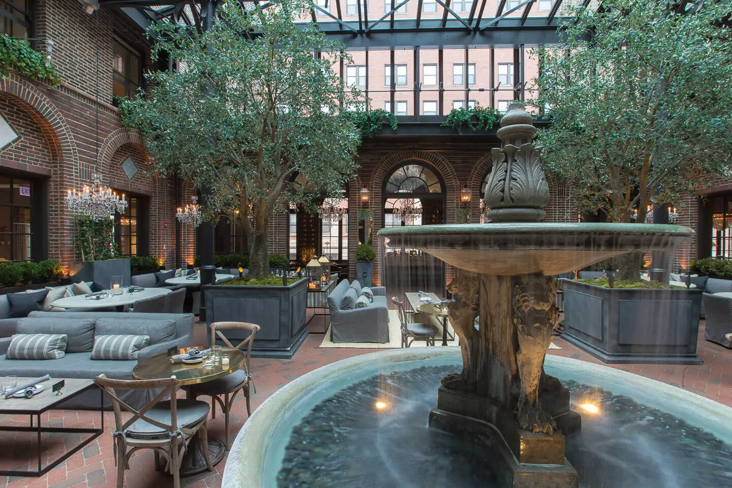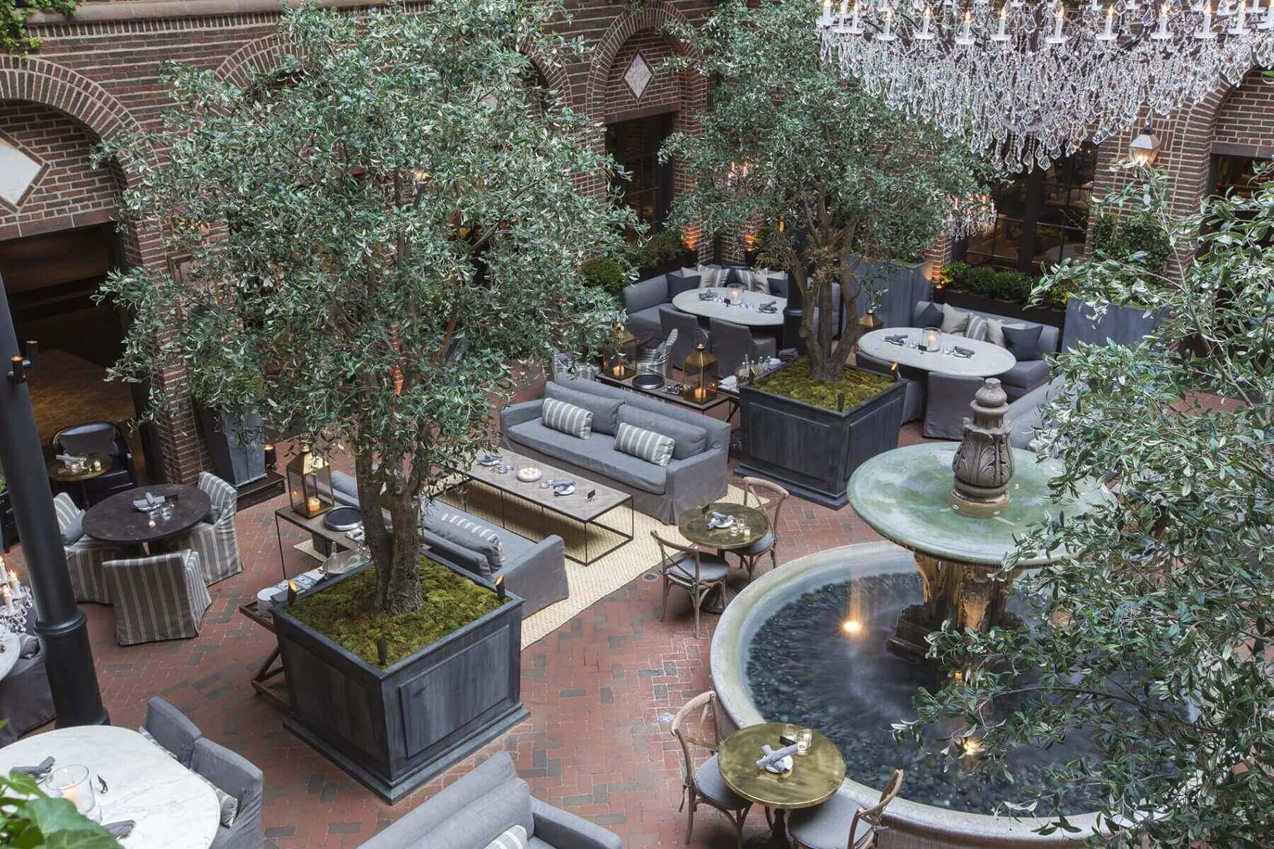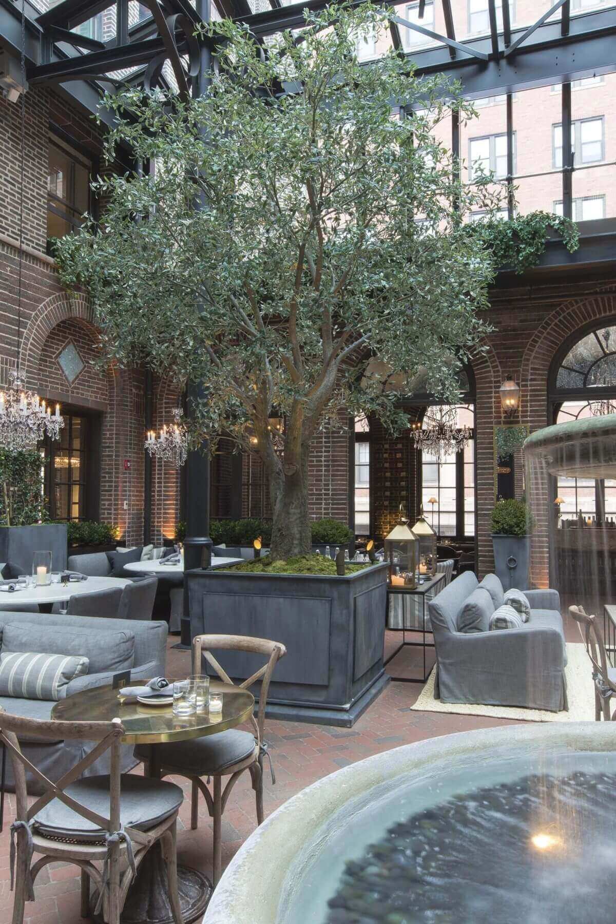 Inside the historic 1914 Three Arts Club—now transformed into RH Chicago, a gallery of luxury home furnishings—Treescapes played a key role in bringing nature into one of the city’s most atmospheric dining spaces. The soaring glass atrium, home to the Three Arts Club Café, features a dramatic landscape of custom-fabricated Mediterranean olive trees, carefully engineered and hand-crafted by Treescapes to create a serene, timeless canopy.